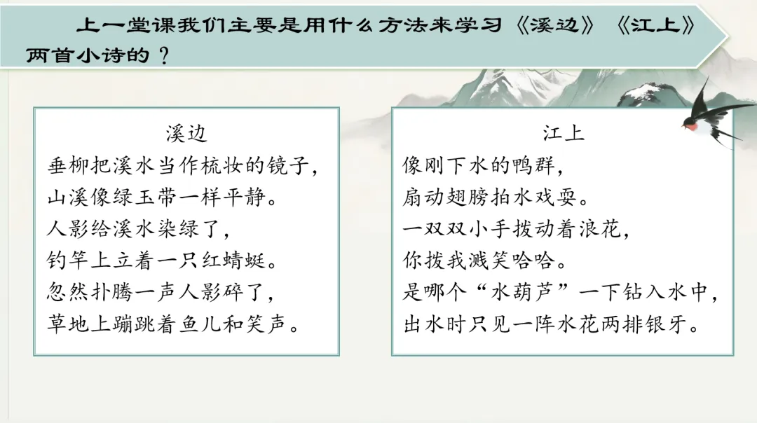 还记得我们用什么方法学习这两首诗的吗?(预设1:先读诗,找到不理解的地方,运用联系上下文的方法读懂。预设2:还可以联系生活实际、利用插图等方面读懂不理解的地方。)
