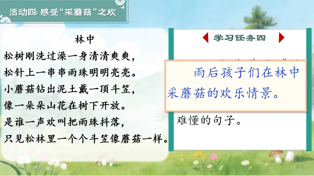 这首诗描写的是什么情景?(雨后孩子们在林中采蘑菇的欢乐情景。)