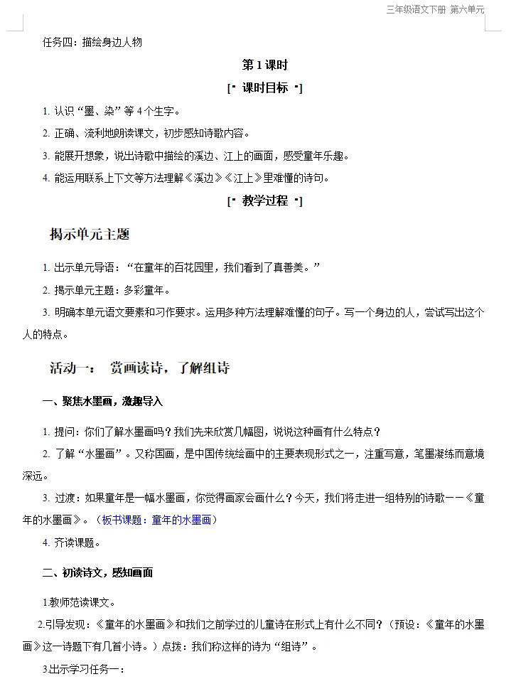 AI赋能2026春·新版精选||三下6单元《童年的水墨画》2课时精品教学六件套(课件/教案/逐字稿/反思/任务单/板书)