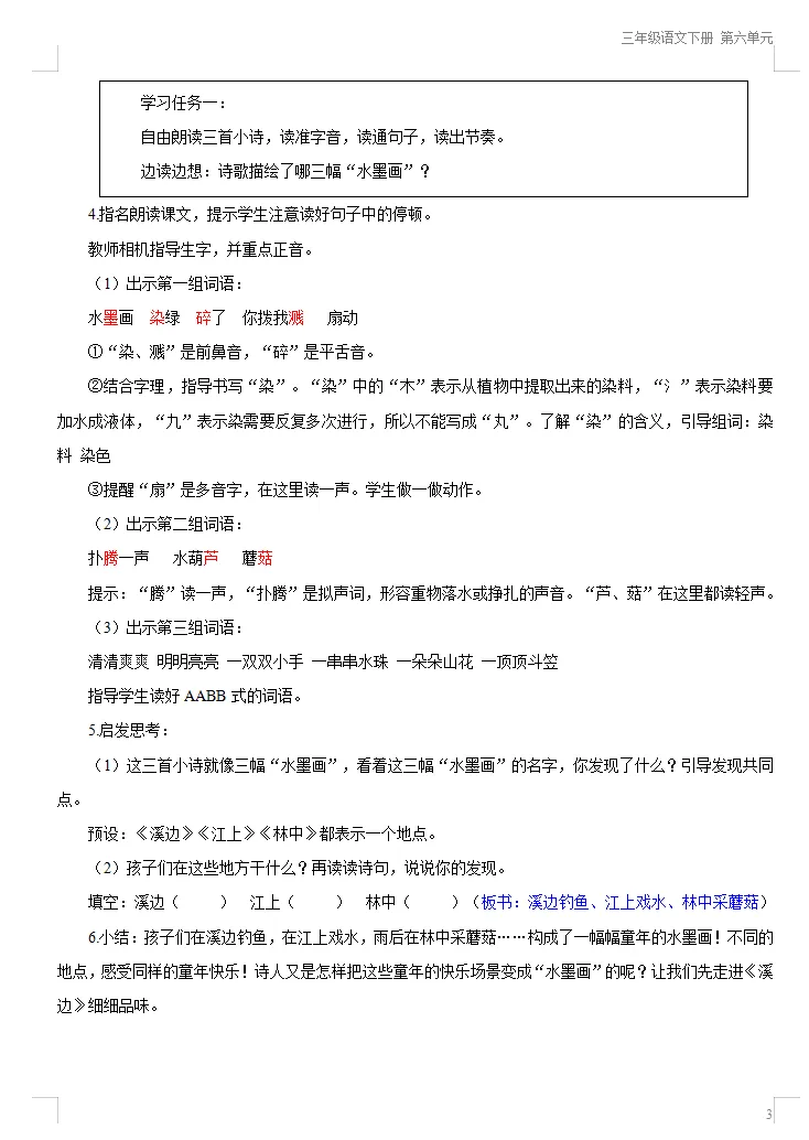 (p6)首先,请听老师为大家范读课文。(配乐范读,声情并茂,注意停顿)听完了老师的朗读,大家有没有发现这首诗与我们之前学过的儿童诗有什么不同之处呢?这首诗下面有三首小诗!观察得真仔细!这种形式的诗我们称之为“组诗”,这组诗中的每一首都符合水墨画的特征,寥寥数笔就勾勒出一幅幅儿童生活的欢乐画卷。