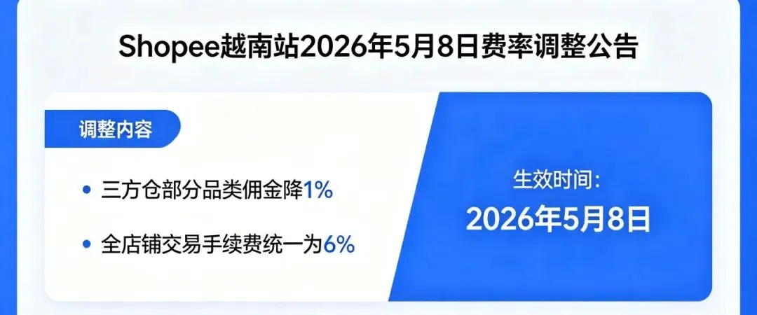 Shopee越南站正式发布费率调整通知,两项核心调整将于2026年5月8日(当地时间)正式生效,旨在优化平台运营效率,同时为卖家减负。本次调整主要涉及佣金费率与交易手续费两大板块,具体细节如下:其一,三方仓店铺佣金下调。自5月8日起,Shopee越南站三方仓店铺部分品类佣金费率(含税率)将下调1%,新费率仅适用于该日期后生成的订单。需注意,本次佣金调整仅针对三方仓店铺特定品类,其他品类佣金费率保持不变。其二,交易手续费统一标准化。调整后,越南站点所有跨境直邮店铺、官方海外仓店铺及三方仓店铺,交易手续费率将统一调整为6%(含税率),同样仅适用于5月8日后新增订单。此次费率调整,三方仓特定品类佣金下调将直接降低卖家运营成本,而交易手续费的统一则简化了计费流程,帮助卖家更高效规划运营成本。
