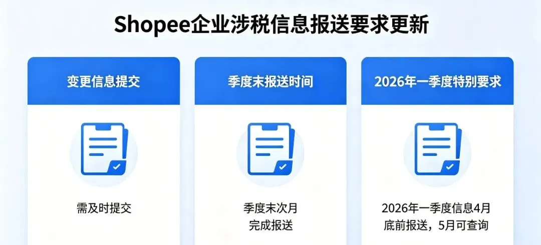Shopee近期发布《互联网平台企业涉税信息报送规定》最新实施通知,明确企业涉税信息报送相关操作要求,提醒广大卖家及时关注并规范操作。通知明确,若卖家的营业执照公司名称、企业法人等核心涉税信息,在季度内发生变更,需及时通过Shopee客服提交相应的变更材料。Shopee将按照税务部门相关要求,分别报送信息变更前后不同时间段的涉税数据,确保信息报送的准确性与合规性。关于信息报送时间,平台明确计划在每个季度结束后的次月末完成该季度涉税信息报送。例如,2026年第一季度的涉税信息,将于4月底前完成报送,卖家可自5月起,登录Shopee卖家跨境自助服务站,查询相关涉税报送数据。