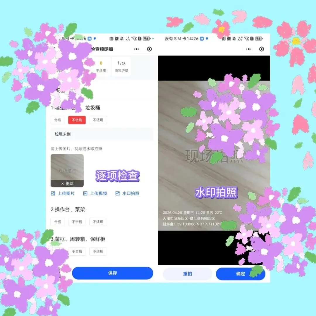 督导到店后,打开企鲸的五一专项检查单,逐项核对。关键检查项(如灭火器压力,冰箱温度)强制使用企鲸水印相机拍照,照片自动叠加不可篡改的时间,地点,门店信息。无法事后补拍,无法P图造假