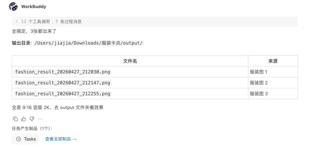 这样我们的3个skill的功能都合并起来了,每当我们传递一张原图(模型图)+ 3张服装图的情况下,就能自动的调用这一个大的skill完成图片、视频、合成视频全流程的制作
