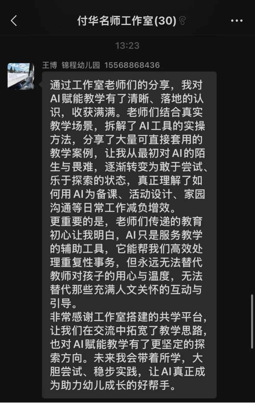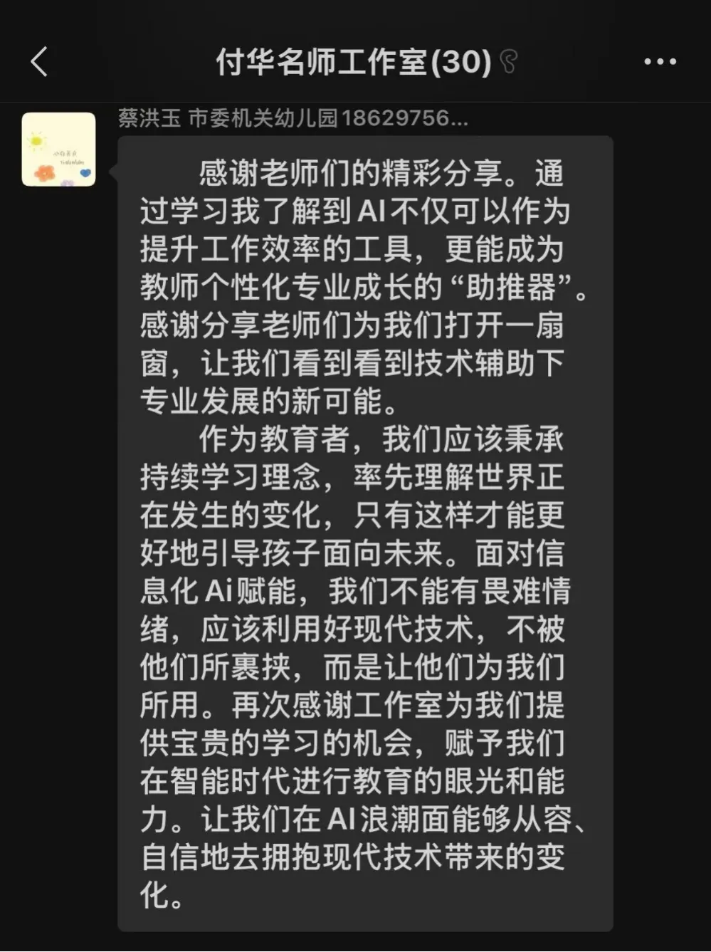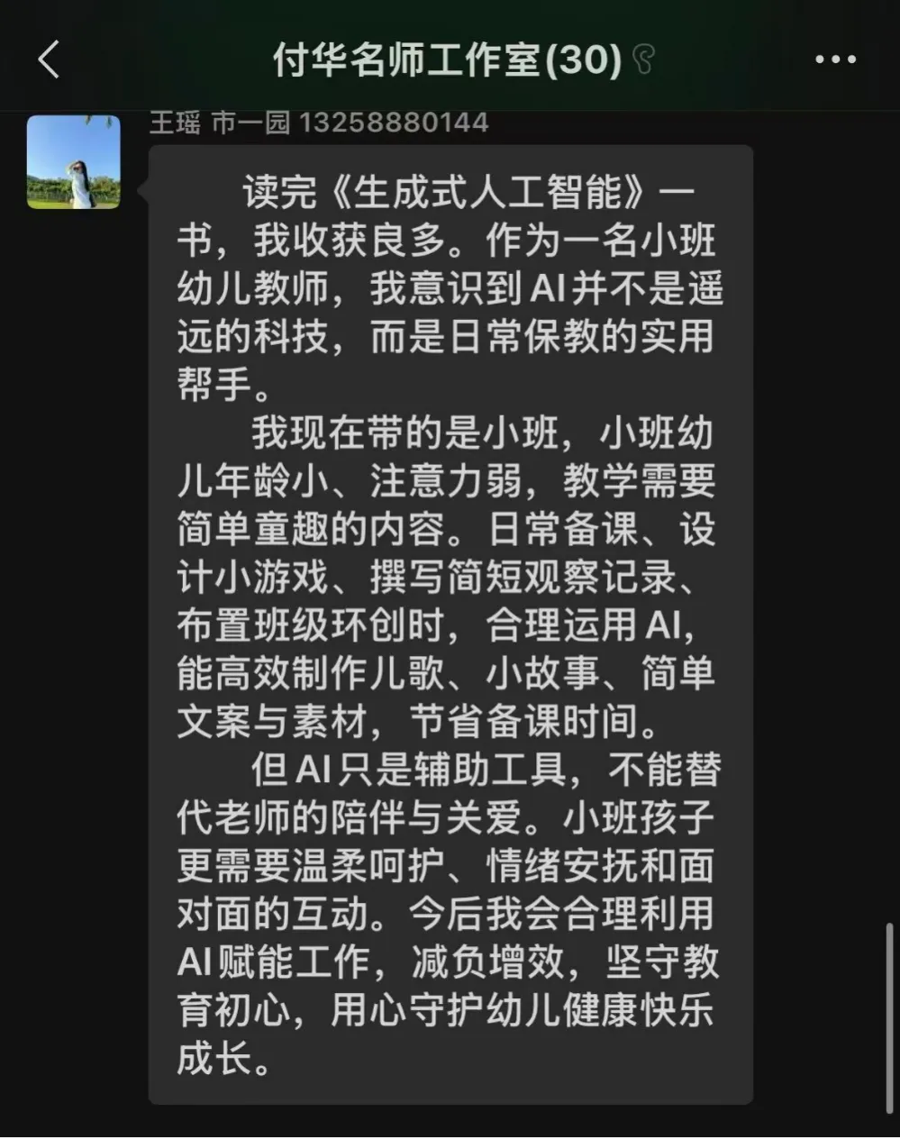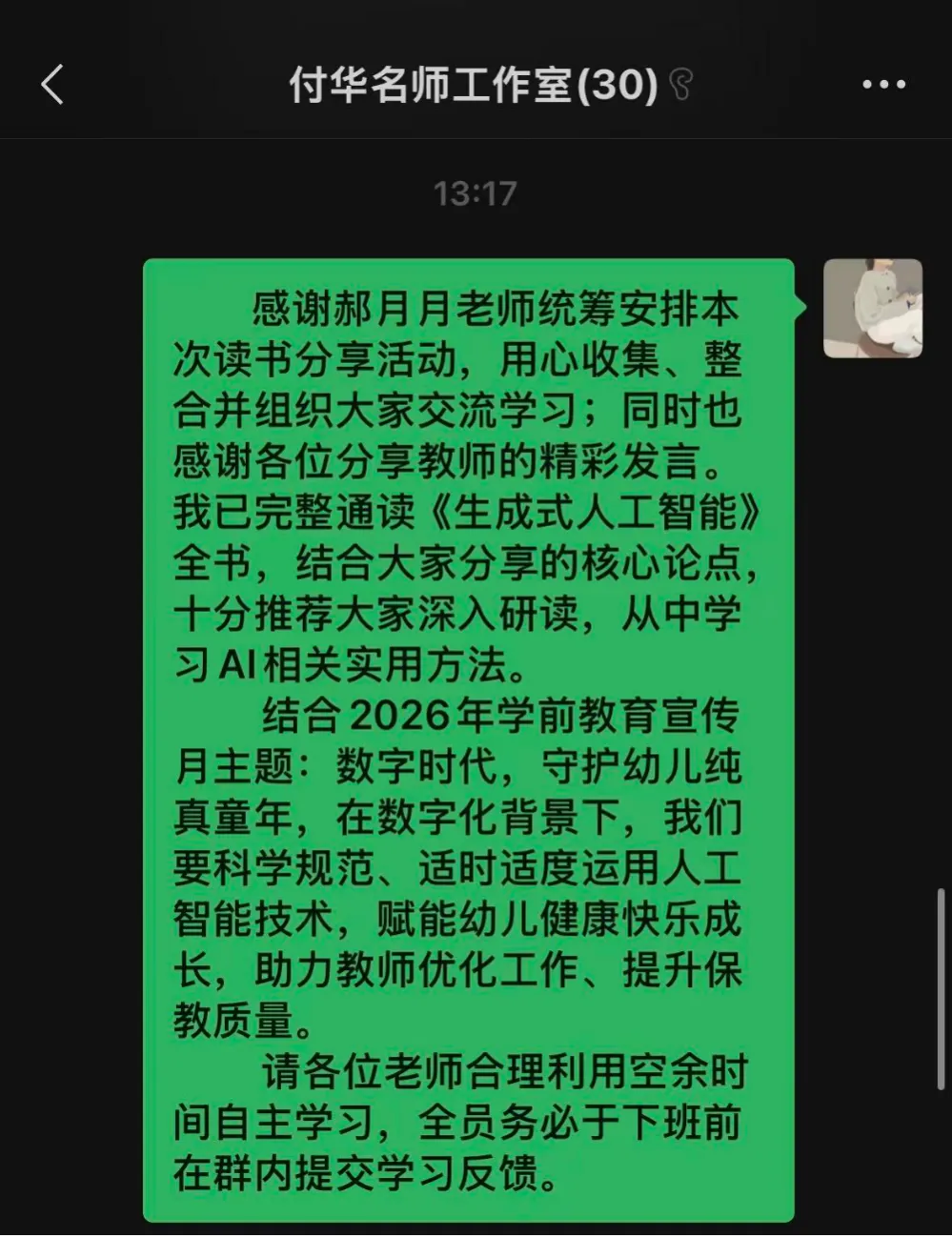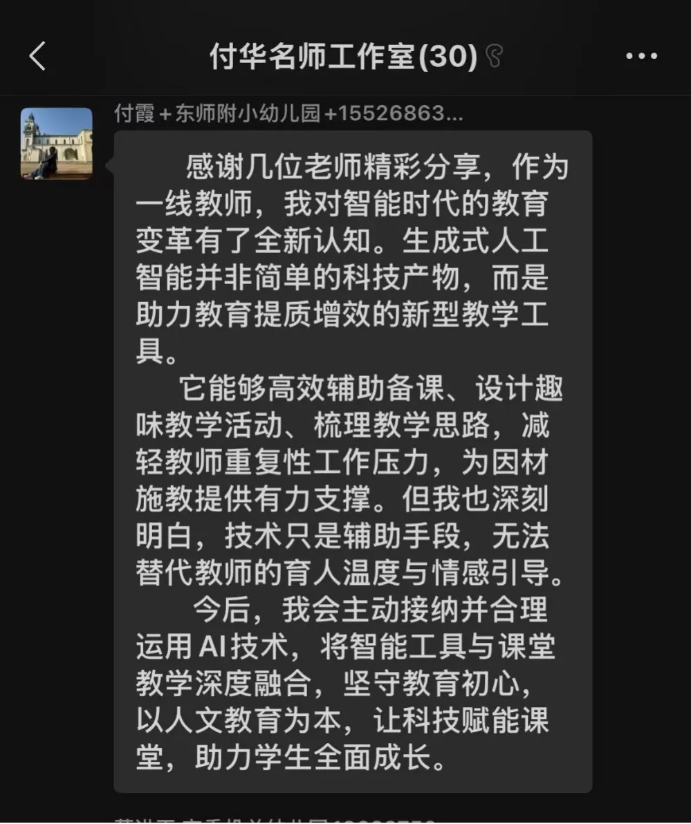 线上分享过程中,工作室全体教师认真学习、积极互动,纷纷发表学习感悟: 生成式AI是增效器、好帮手,非“替代教师”;掌握可用于班级的实操方法,守住伦理底线,让技术更安全、教育更温暖。付华名师工作室此次生成式人工智能专题读书分享,是常态化共读共研重要载体,既提升教师数字素养与AI应用能力,又强化“以幼为本、技术赋能”教育理念,落实宣传月精神,惠及幼儿。