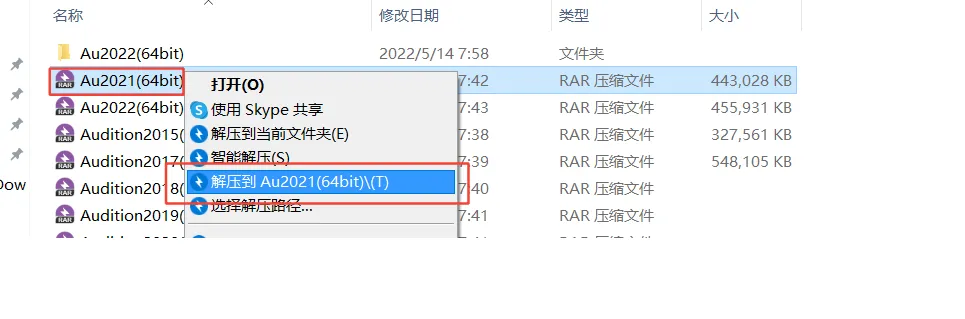 1.鼠标右击【Au 2021(64bit)】压缩包选择【解压到 Au 2021(64bit)】