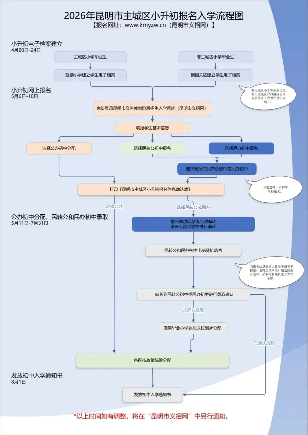 2026年昆明市主城区小升初报名工作将于5月6日0时-5月10日24时进行,请六年级学生家长做好准备。届时,请登录“昆明市义务教育阶段招生入学系统”(昆明市义招网,网址:www.kmyzw.cn)报名。