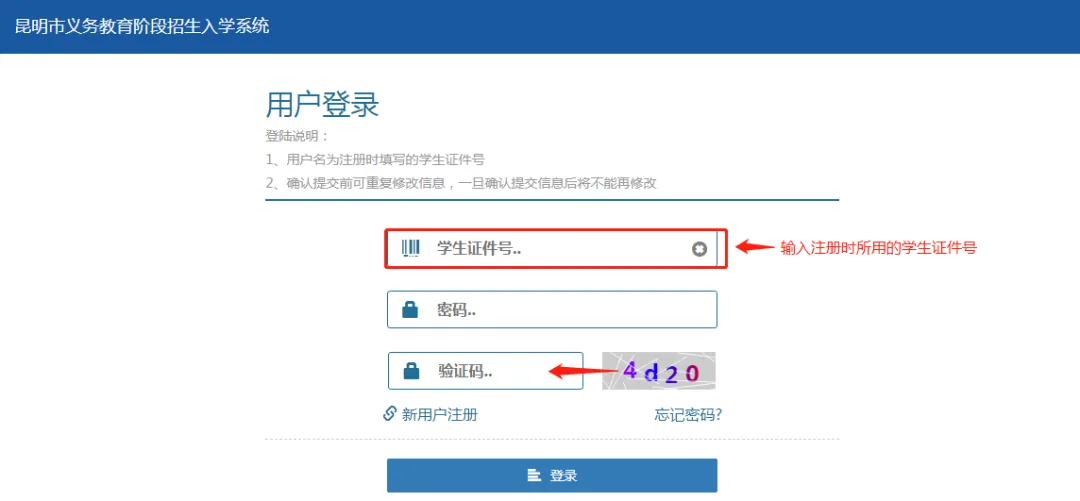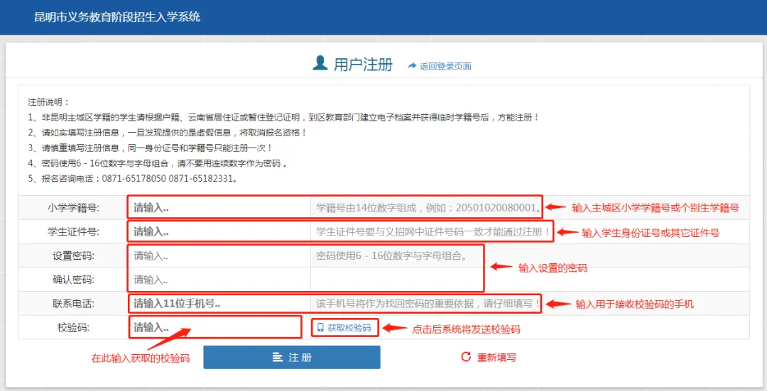 1)注册时,系统会依据昆明市义招网中的档案数据进行核验,如系统提示学籍信息有误,学生及家长应联系就读小学或小学所属教育行政部门进行咨询,以获得学生正确的学籍信息。