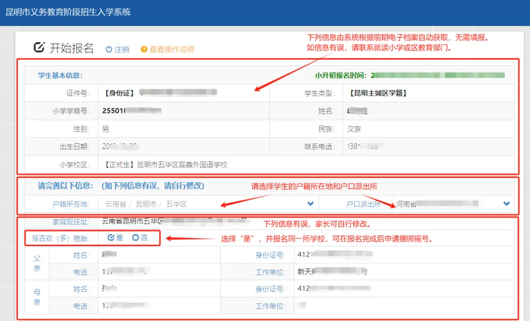 系统会依据前期毕业小学或区教育部门在昆明市义招网中建立的电子档案,自动填写学生基本信息,请家长根据所列信息修改完善即可。如下图所示: