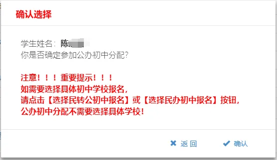 学生家长点击“选择公办初中分配”后,系统会根据选择方式提示学生家长是否确认选择参加公办初中分配(注意!!!重要提示!!!如需要选择具体初中学校报名,请点击【选择民转公初中报名】或【选择民办初中报名】按钮,公办初中分配不需要选择具体学校!)。如下图所示: