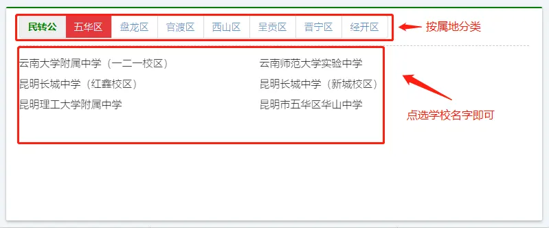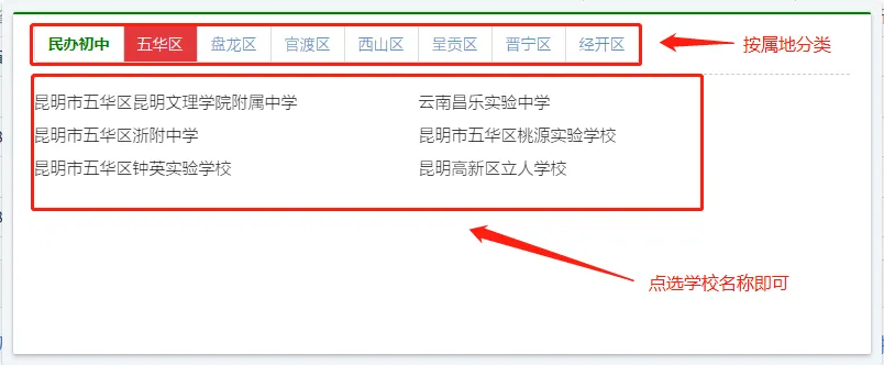 学生家长点击“选择民转公初中报名”后,系统会弹出选择菜单,在菜单中民转公初中以属地进行分类,学生家长自行选择需要报名的初中学校即可(提示:只可选择一所学校报名)。如下图所示: