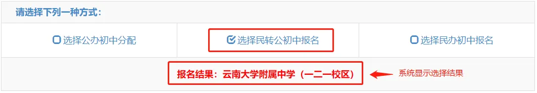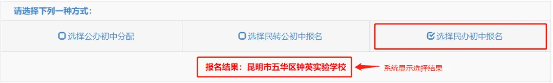 学生家长按照自愿原则,点击“选择公办初中分配”“选择民转公初中报名”或“选择民办初中报名”其中一种方式报名。如下图所示: