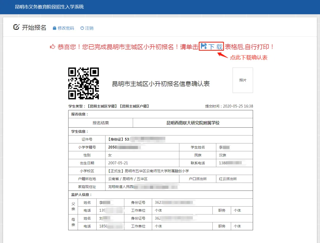 注意:请只点击了“保存信息”的学生及家长,在5月10日以前对信息进行核实修改,并点击“确认信息无误提交”。只有确认信息提交,并打印信息确认表,网上报名才算完成,否则将视为网上报名不成功。