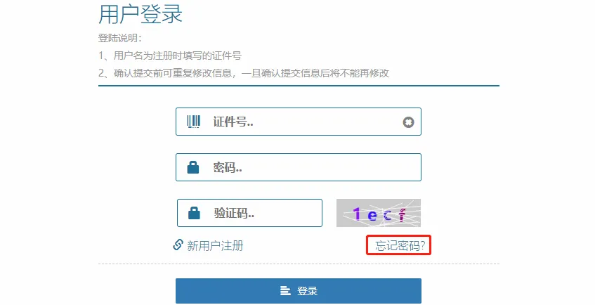 注册成功后,在登录页面中填写报名学生注册时所使用的身份证号或其他证件号、登录密码和验证码后,点击“登录”即可进入网上报名页面。如下图所示: