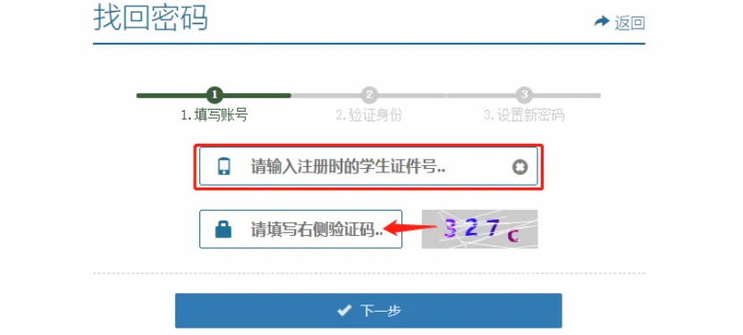 进入页面后,按照系统引导填写注册时所使用的学生证件号,利用注册时的监护人手机接收验证码,根据系统提示重置密码。如下图所示