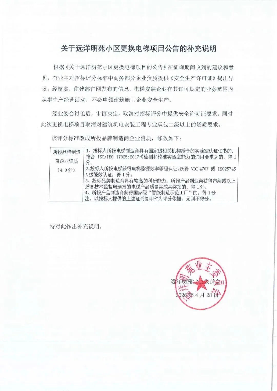 关于远洋明苑小区更换电梯项目的补充说明