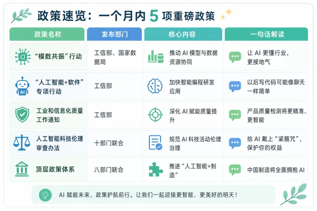 如果你觉得”政策文件”听起来很枯燥,别担心!我们先来个”政策速览”,用一句话概括每项政策的核心: