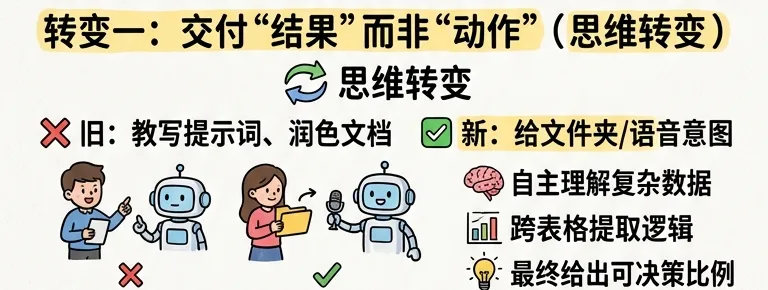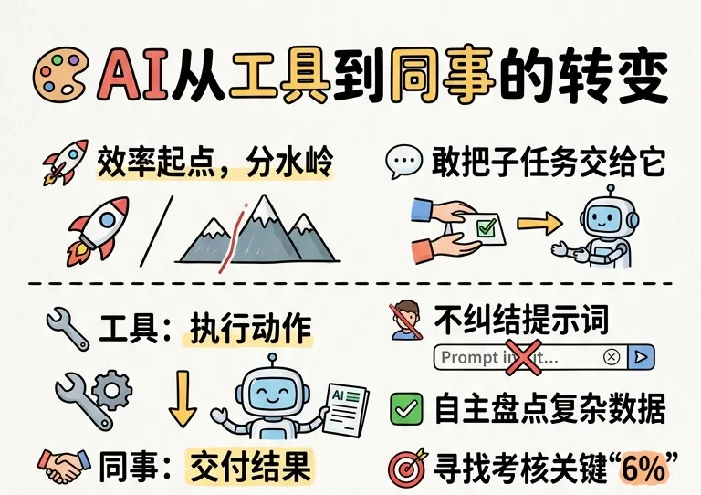 很多人用AI,还在纠结提示词怎么写才漂亮,这其实还是在把AI当成一把“更快的铲子”。真正的分水岭在于:你敢不敢把一个完整的子任务交出去?就像润总提到的公众号数据分析,几十个乱七八糟的Excel,以前得人工一条条比对,现在你只需要把意图告诉这位“AI同事”。它不仅会写程序、读结构,还能自主完成从找规律到算比例的全过程。