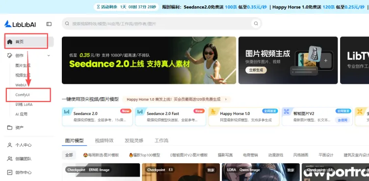 二、第一步:怎么进入 Liblib 里面的 ComfyUI?(新手必看)