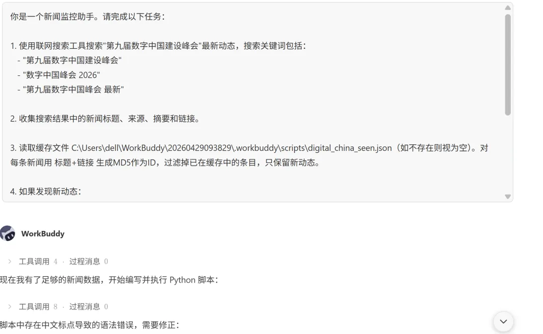 4月29日,第九届数字中国建设峰会在福州开幕。没有搜到直播号,但也想关注下峰会上的新鲜事儿。于是,突发奇想寻求了Workbuddy的帮助,请它全网搜索相关新闻,每隔1小时推送到我手机上。没想到,还真的实现了,而且操作非常简单。