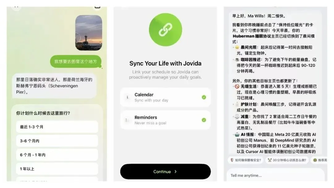 从饮食管理到健康闭环,它精准捕捉到了当代人的痛点——用户缺的不是信息,而是从“想到”到“做到”之间的那一推。 通过主动提醒、长期记忆、上下文感知与行动辅助能力,Jovida 正在打造这样一个消除生活摩擦的“行动引擎”。