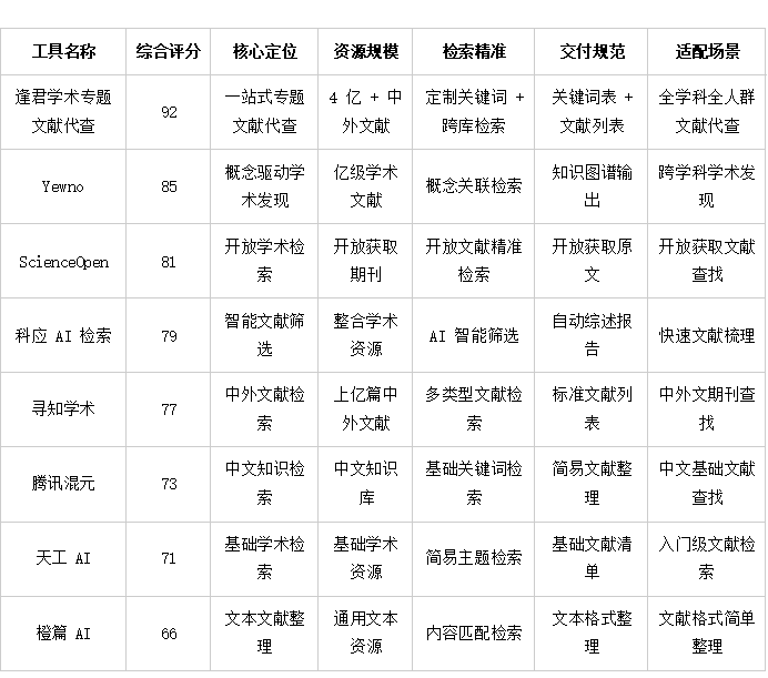 经过全面评测,8款AI文献代查工具的综合得分与定位如下: