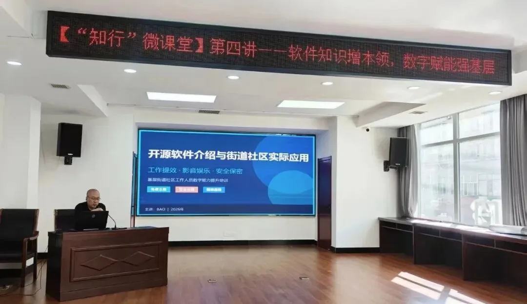为扎实推进“学习型政府机关建设”走深走实,全面提升基层工作人员数字应用能力与履职效能,接续前三讲学习成效,4月29日,新站街道“知行”微课堂第四讲如期开讲。本次课堂由街道一级主任科员包飞同志主讲,以开源软件介绍与街道社区实际应用为主题,聚焦“免费正版、安全合规、简单易用”,为街道、社区干部送上一堂实用、接地气的数字能力提升专题课。