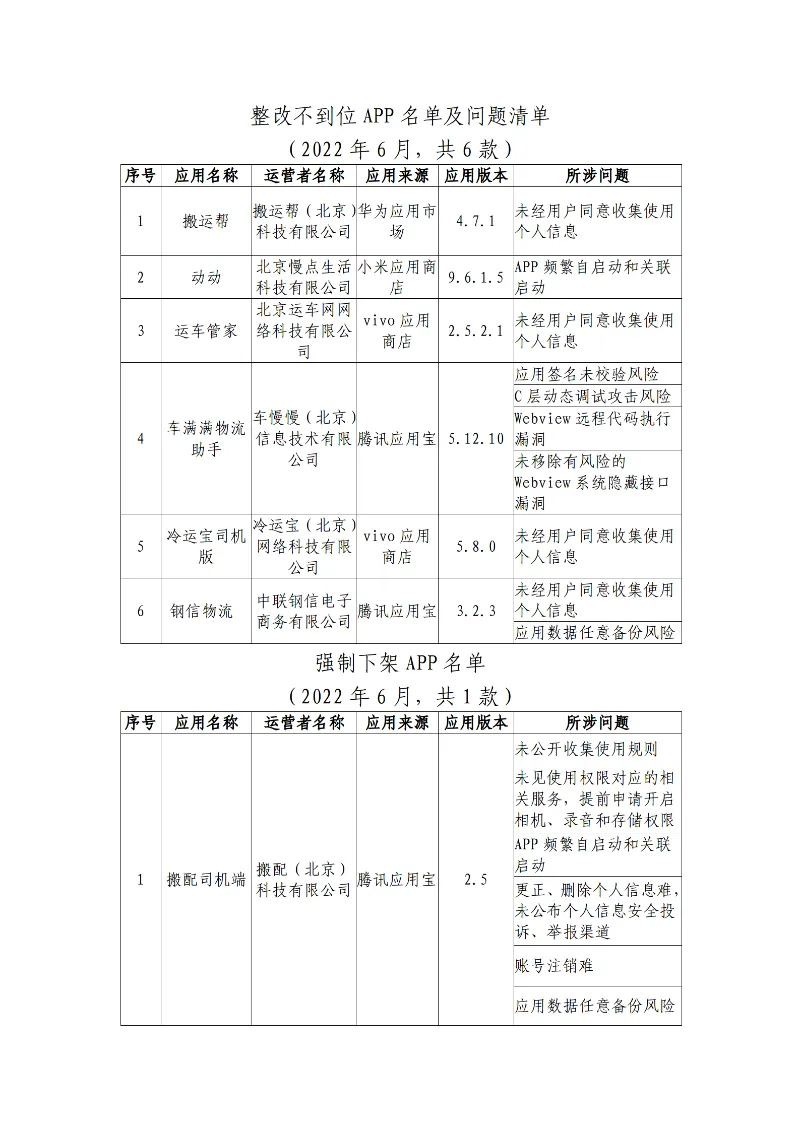 截至目前,尚有7款APP未按照我局要求完成整改。其中1款APP未在规定期限内整改且未提交整改报告,我局已通知相关应用商店予以下架处置; 6款APP整改不到位,仍存在不同类型问题(详见附件)。请上述整改不到位的企业于8月6日前完成整改并向我局提交整改报告,逾期仍整改不到位的,我局将依法依规组织开展相关处置工作,切实维护APP用户合法权益和网络安全秩序。