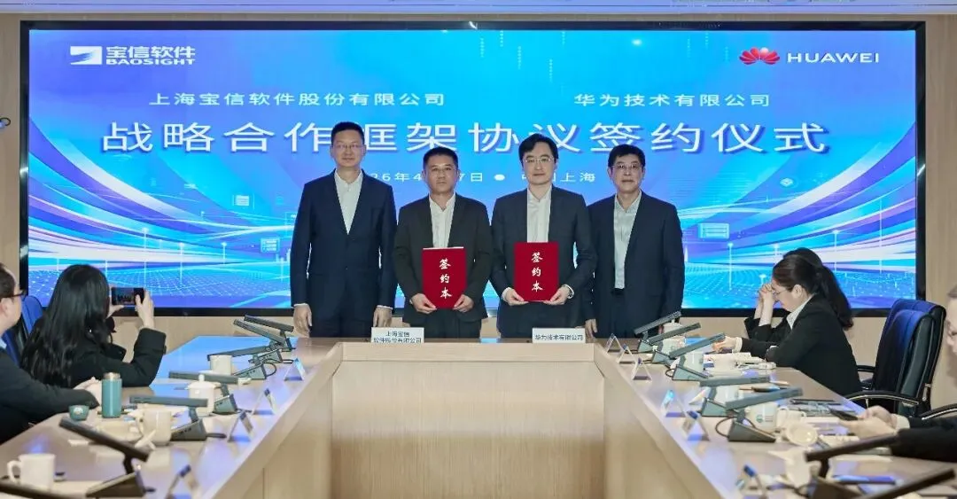 【中国,上海,2026年4月27日】上海宝信软件股份有限公司(简称:宝信软件)与华为技术有限公司(简称:华为)在上海宝信软件总部签署战略合作框架协议。上海宝信软件股份有限公司党委书记、董事长田国兵,华为公司副总裁、油气矿山军团CEO蒋旺成出席活动并见证签约。宝信软件工业智能研究院党总支书记、副院长陈晓武,华为钢铁有色军团总裁石矛代表双方签约。