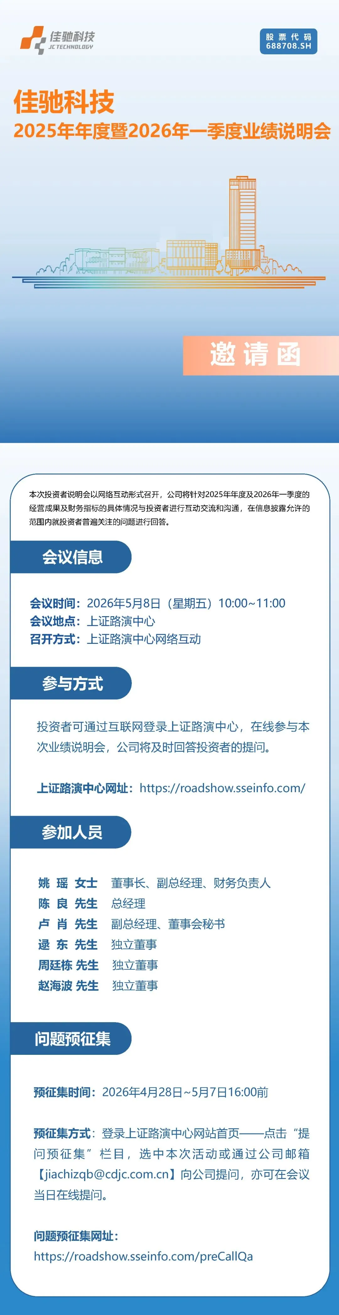 感谢您对佳驰科技的关注与支持!成都佳驰电子科技股份有限公司(股票代码:688708.SH),诚邀您参加即将在5月8日(星期五)召开的2025年年度暨2026年一季度业绩说明会。