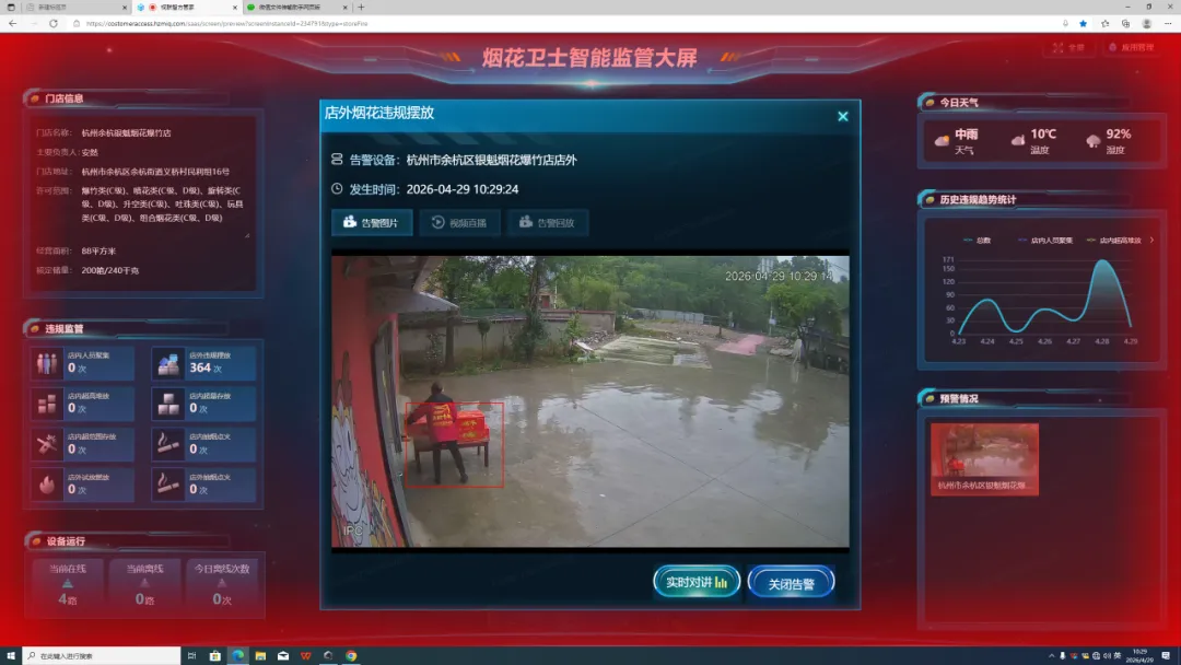 4月29日,区应急管理局组织开展“AI+烟花卫士”智能监管全流程演练。演练模拟某零售店门外违规摆放烟花爆竹,“烟花卫士”智能监管系统随即触发报警:某零售店门外违规摆放烟花爆竹。
