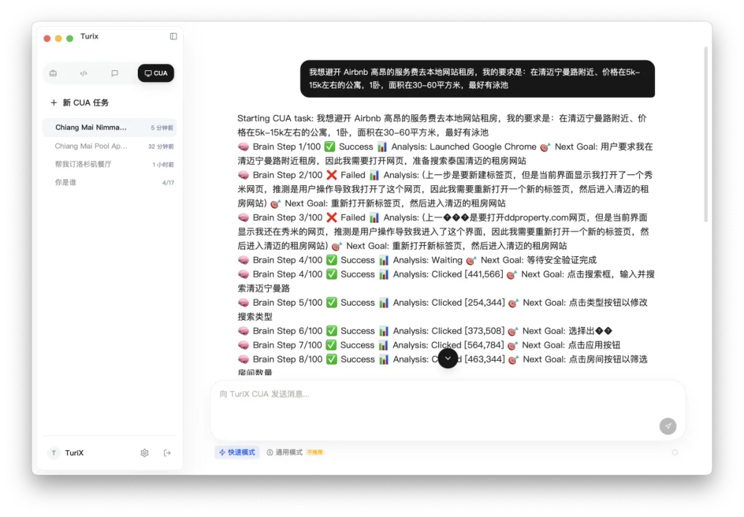 全网比价,搞定本地短租房:长居海外,各种不同的租房网页懒得筛选,你只需吩咐一句“帮我在清迈宁曼路找个带泳池、月租3000以内的公寓”,TuriX 就会自动打开合适的租房网站,还能自动识别网站弹窗并关掉,然后按你的要求帮你筛选好,你只需等待结果交付。