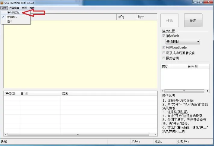 一、运行刷机工具–选择左上角的文件按钮–选择导入烧录包