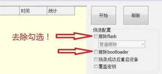 三.烧录包加载完毕,注意:一定要去掉两处勾选:擦除falsh和擦除bootloader;