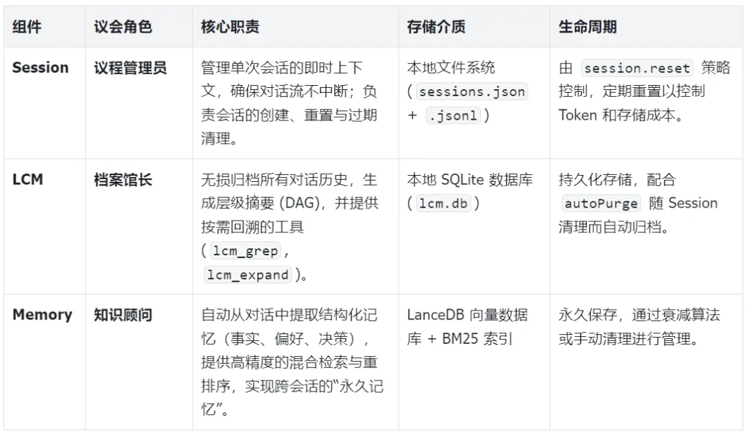 Memory 是知识提取者:它不存储原始对话,只提炼“记忆点”,这保证了即使 Session 重置、LCM 摘要老化,关键知识依然可以被精准召回。