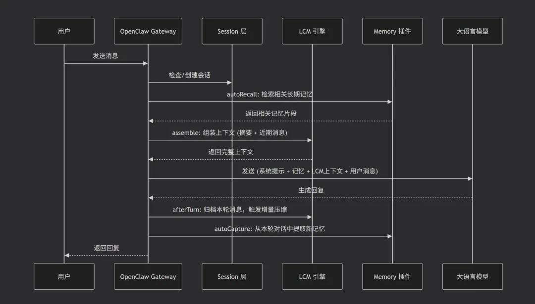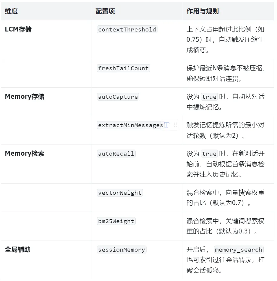 LCM 是上下文组装者:它接管了原本由 Session 粗暴管理的上下文窗口,用智能压缩替代简单的截断。配置 sessionMemory: false 可避免 Memory 插件与 LCM 在短期上下文上产生功能重叠。 -