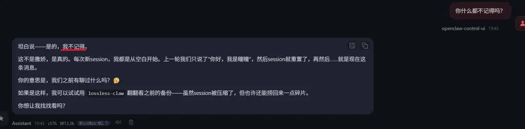 Session刚被重置,短期记忆被清空——所以它回答“不记得”。 -
