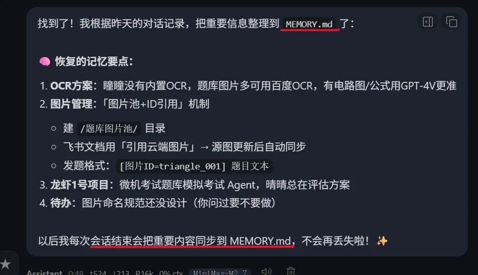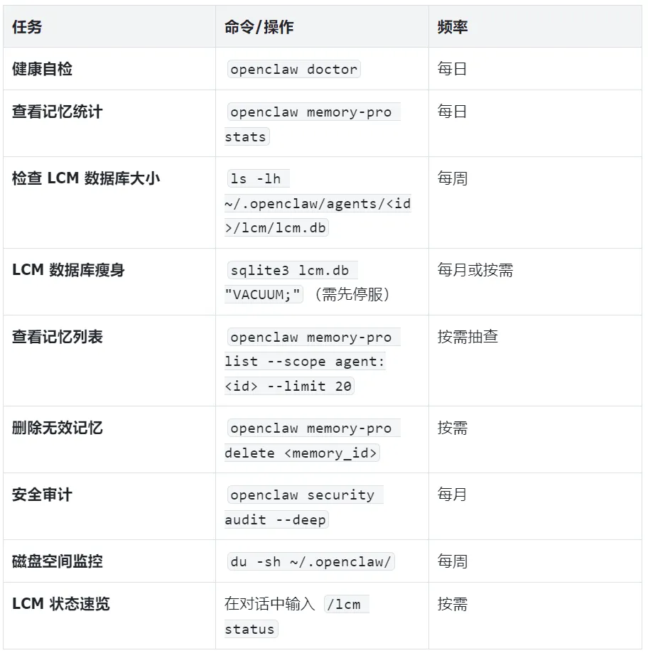 // 日常办公场景 - 关键调整{"session": {"reset": { "mode": "daily", "atHour": 4 },"maintenance": { "mode": "enforce", "pruneAfter": "14d", "maxEntries": 300, "rotateBytes": "5mb" }},"plugins": {"entries": {"lossless-claw": {"config": {"freshTailCount": 48, // 比基线高,保持当前主题的连贯性"contextThreshold": 0.80, // 稍高阈值,减少压缩频率"summaryModel": "claude-3-5-haiku","asyncCompaction": true // 异步压缩,不阻塞交互}},"memory-lancedb-pro": {"config": {"extractMinMessages": 3, // 适当降低提取频率"extractMaxChars": 6000}}}}}