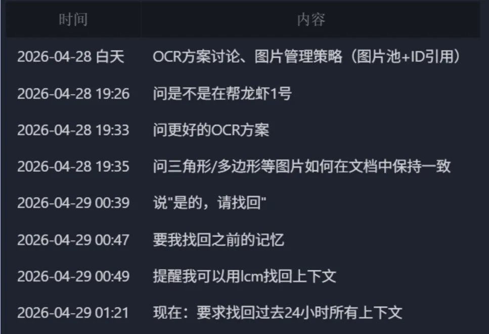 LCM虽然已经无损备份了刚才的对话,但还没来得及生成摘要——所以它只能“提示”可以从 LCM 里找,而不能直接给出答案。 -