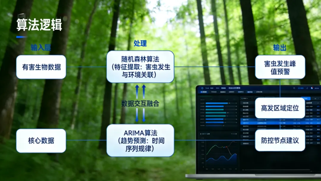 项目中,团队对比豆包、千问、Kimi三款主流智能工具,从预测准确率、操作难度、结果易懂性、使用成本四大维度综合评估,最终优选豆包“随机森林+ARIMA”融合算法作为核心方案。该算法可精准提取害虫发生与环境的关联特征、捕捉时间序列规律,对草履蚧发生时间预测准确率达92%,危害程度分类准确率90%,平均偏差仅1.2天,真正实现“精准预判、提前预警”。