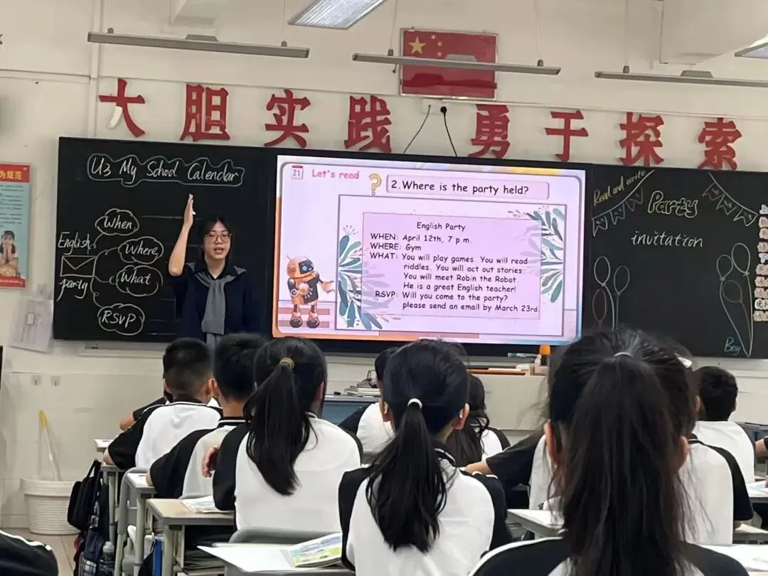 课堂上,潘老师以清晰的教学思路、扎实的教学功底、灵动的课堂互动,融合 AI 技术创新教学模式,为全体教师呈现了一节高质量、现代化的示范阅读写作课。本节课围绕 “校园春日活动” 与 “英语派对邀请函” 两大核心内容展开,紧扣单元主题与教学重难点,层层递进、环环相扣。
