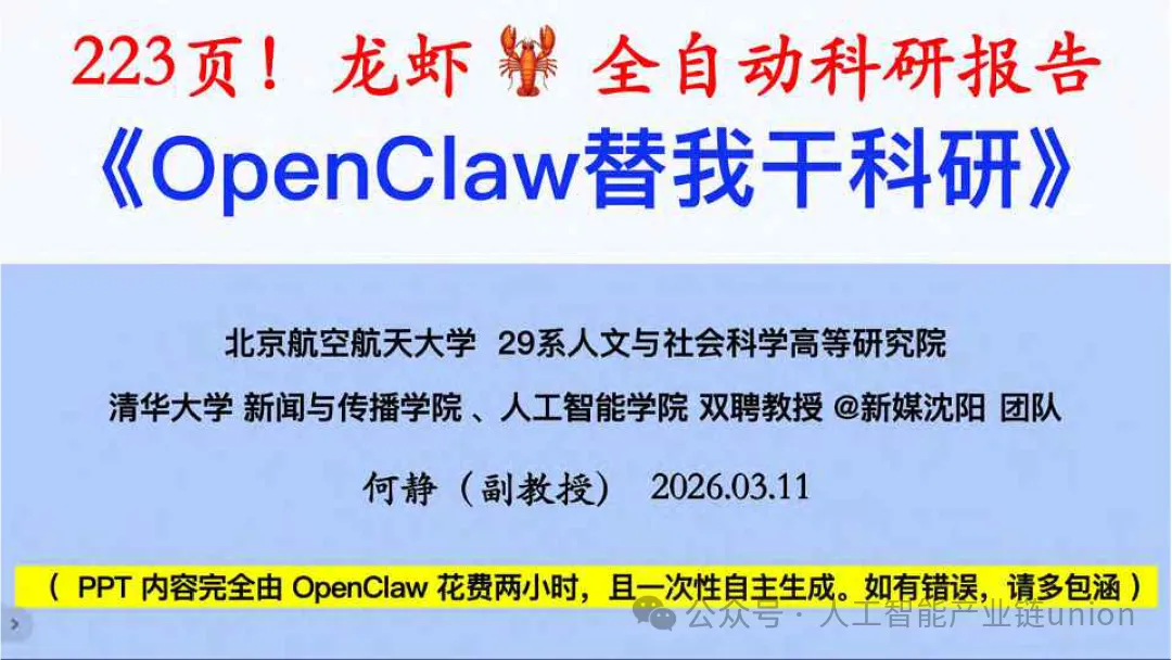 2026年3月11日,清华大学新闻与传播学院、人工智能学院双聘教授 @新媒沈阳 团队与北京航空航天大学29系人文与社会科学高等研究院何静副教授联合发布了一份长达223页的“龙虾全自动科研报告”——《OpenClaw替我干科研》。整份PPT内容完全由OpenClaw花费两小时一次性自主生成,没有任何人工干预。