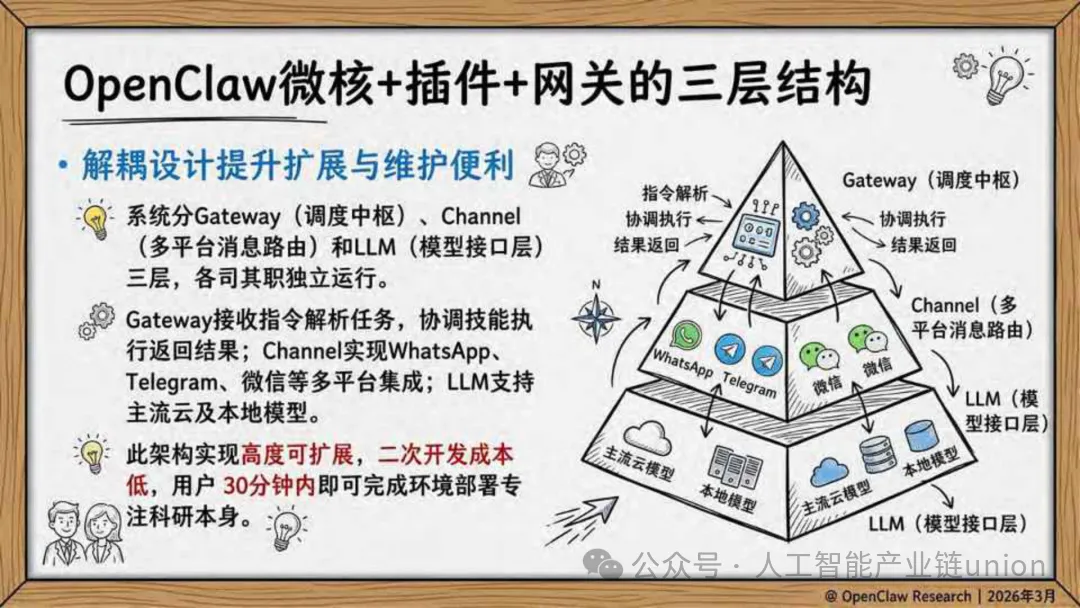 OpenClaw的成长历程堪称传奇。从一个小众黑客项目,迅速成长为全球科研工作者的必备工具。其核心架构采用解耦设计,分为Gateway(调度中枢)、Channel(多平台消息路由)和LLM(模型接口层)三层,各司其职独立运行。