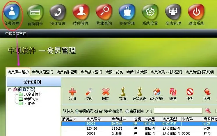 1.首先,登陆中顶洗浴软件前台营业主界面,打开会员管理模块.