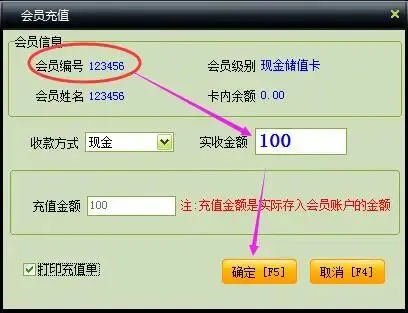 首先,对会员123456进行充值100元.