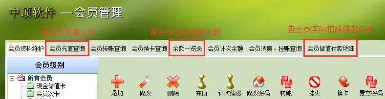 2.在会员管理模块中,会员的储值所有充值历史记录都是在【会员充值查询】报表中查到;所有会员的当前储值余额都是在【余额一览表】中查到;还有会员的实际扣除储值钱数是在【会员储值付款明细】报表中查到.