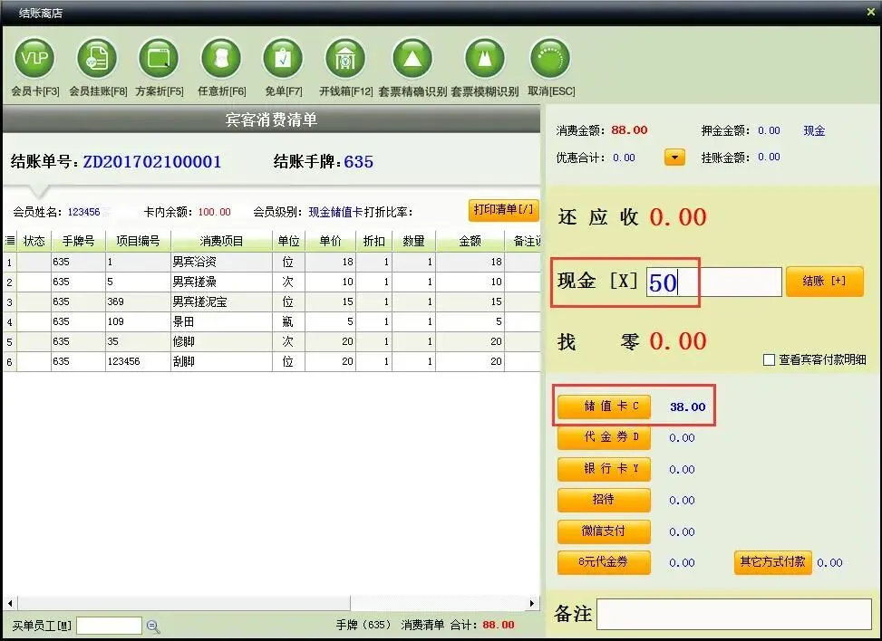 然后,回到中顶洗浴软件前台消费刷此会员卡结账,注意此处刷会员卡只付了38元的款项,其余用现金付款,也就是本单实际消费了88元,而刷会员只扣除了38元的储值.