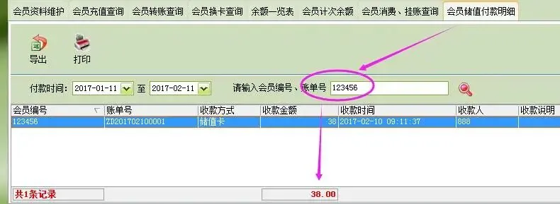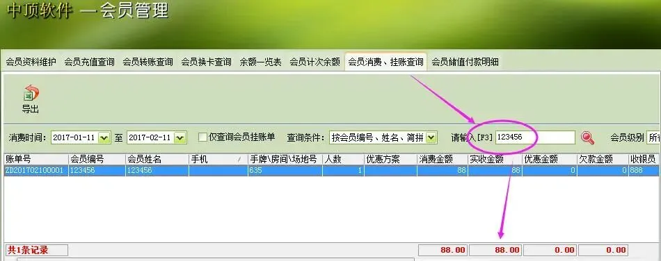 3.关于第2步中说的问题,下面以一个实例来说明【会员储值付款明细】和【会员消费、挂账查询】这二者的区别: