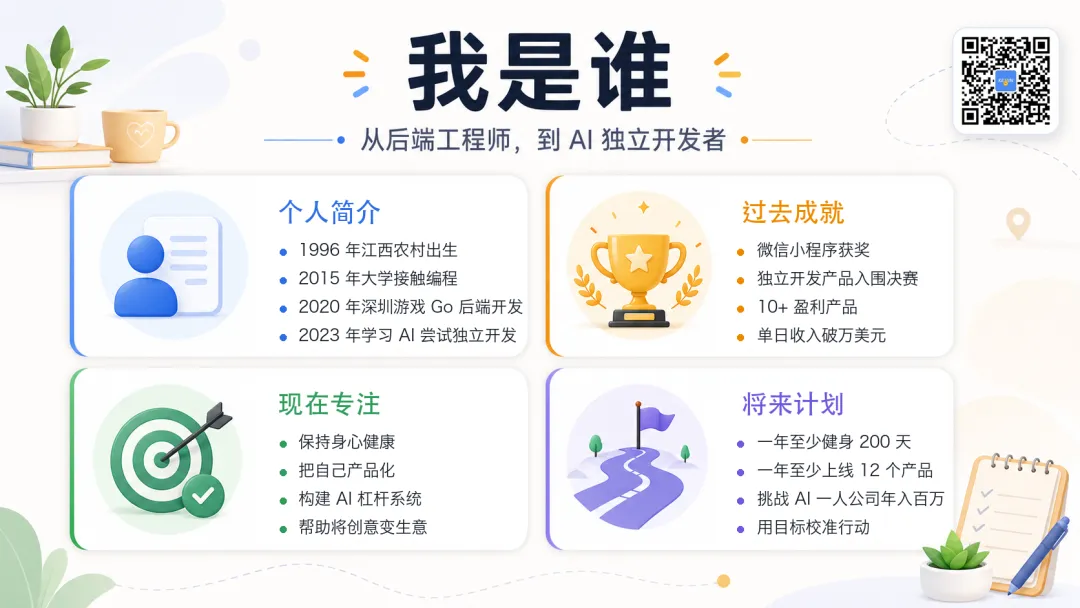 这篇文章,我会完整复盘过去三年。我会讲自己是谁,怎么学习 AI 独立开发,怎么搞定全球收款,赚过多少钱,花过多少成本,做过哪些产品,踩过哪些坑,如果新人现在想开始,我会给哪些建议,推荐哪些工具,以及我的 AI 独立开发时间线。