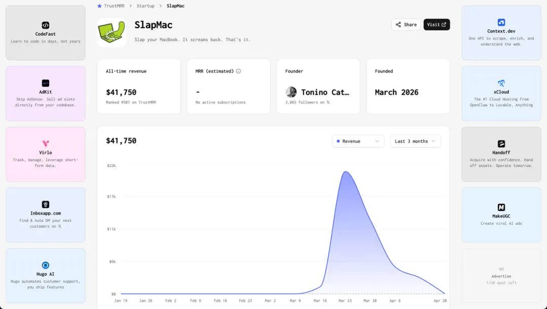 从他的产品收入可以看到,21 号开始入账,27 号达到顶峰,单日入账 5k+美金!虽然没有持续性,但这一波流赚 4w+美金不香吗?